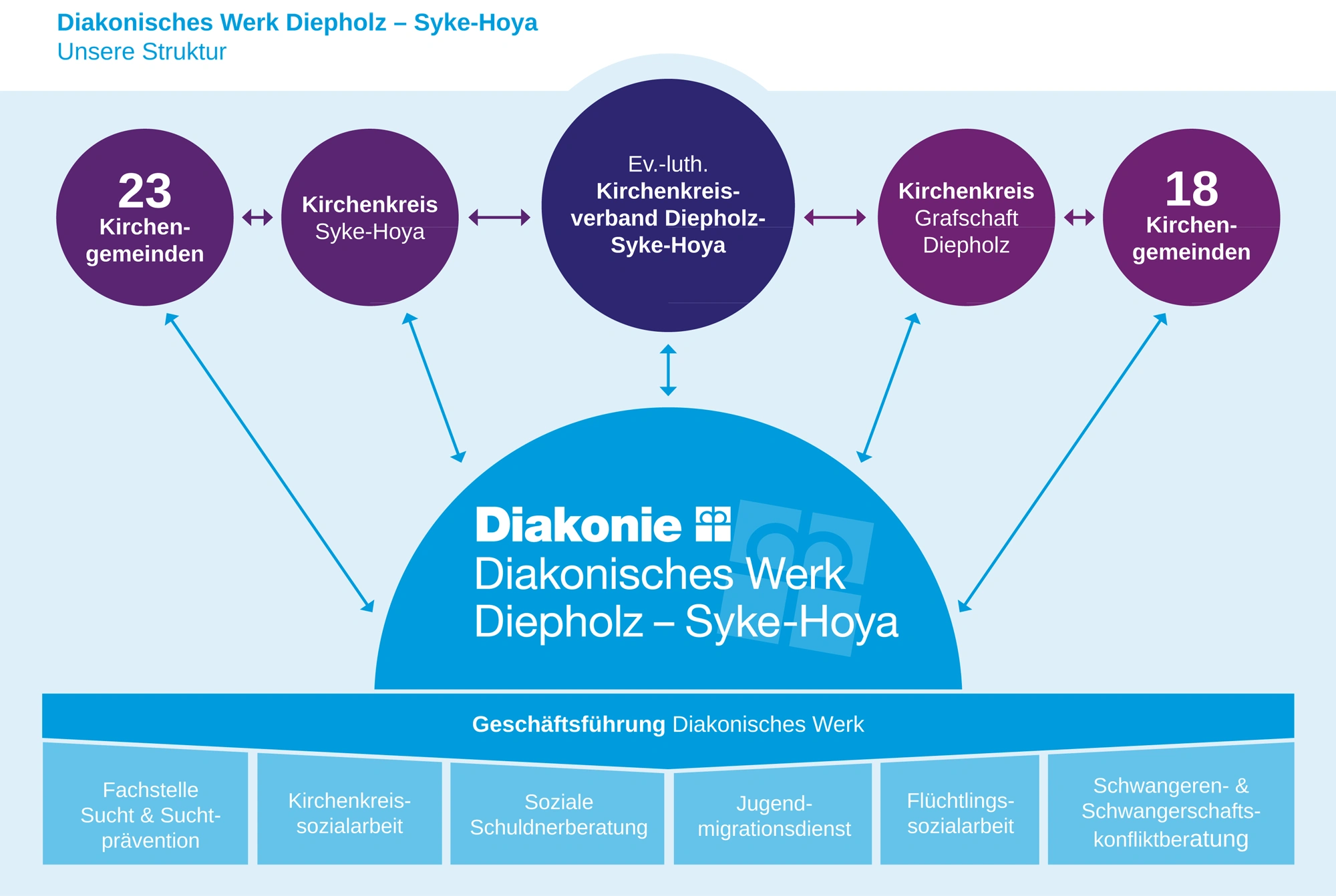 Seit dem 01. Januar 2018 haben sich das Diakonische Werk Syke-Hoya und das Diakonische Werk Diepholz unter dem Dach des Kirchenkreisverbandes zum gemeinsamen Werk Diepholz - Syke-Hoya zusammengeschlossen. Die nunmehr 42 Mitarbeitenden arbeiten in acht unterschiedlichen Beratungsfeldern an insgesamt fünf verschiedenen Standorten (Syke, Hoya, Bassum, Diepholz und Sulingen). Die übergreifende Geschäftsführung hat Marlis Winkler inne.